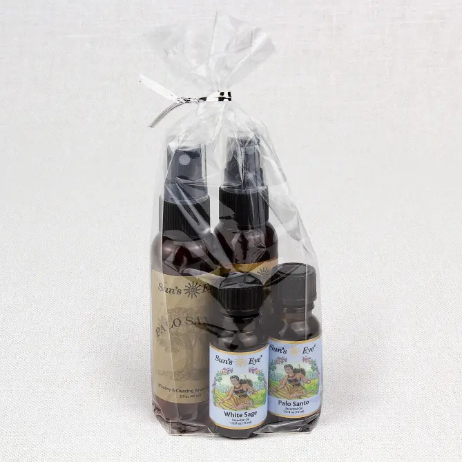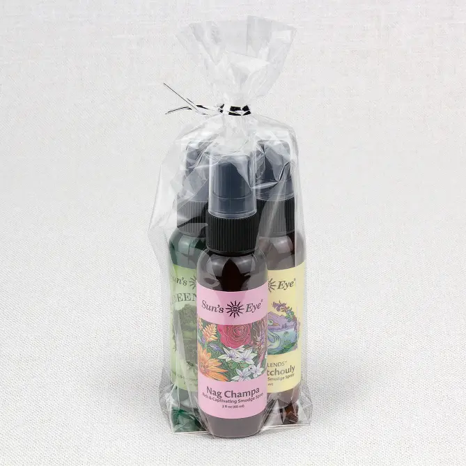 A clear gift bag with silver twist tie for packaging the perfect bundle of 3 mini sprays or 2 mini sprays and 2 oils.